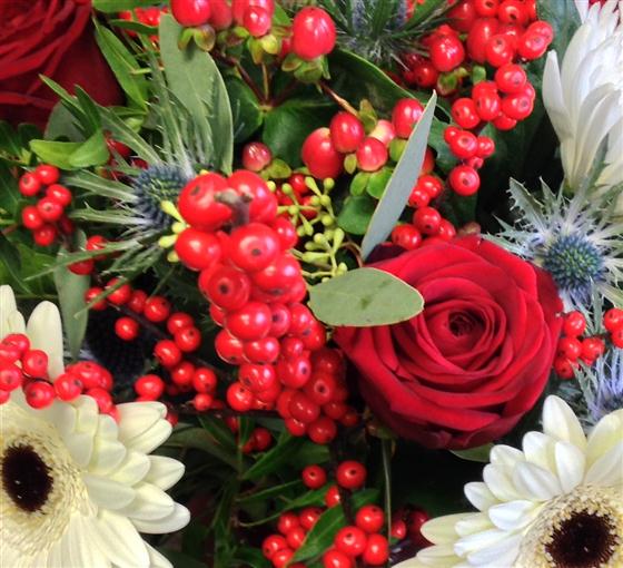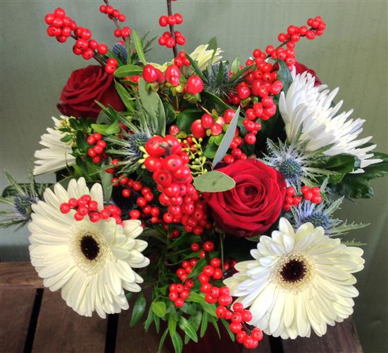 Celebrate Christmas with this wintery look bouquet of warming Christmas flowers selected on the day by our florists.Seasonal selection flowers will vary.