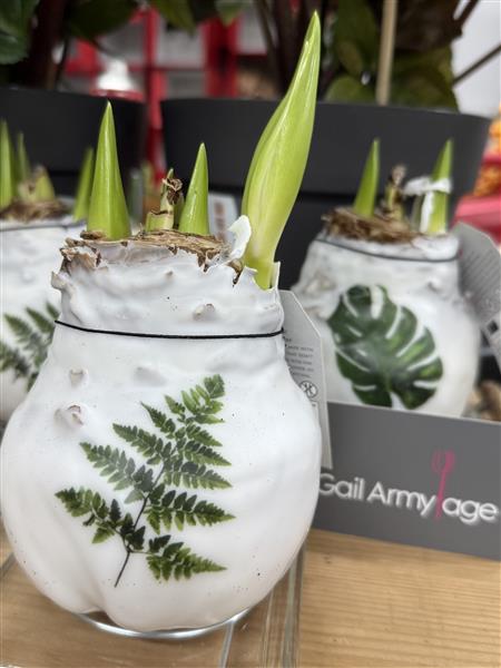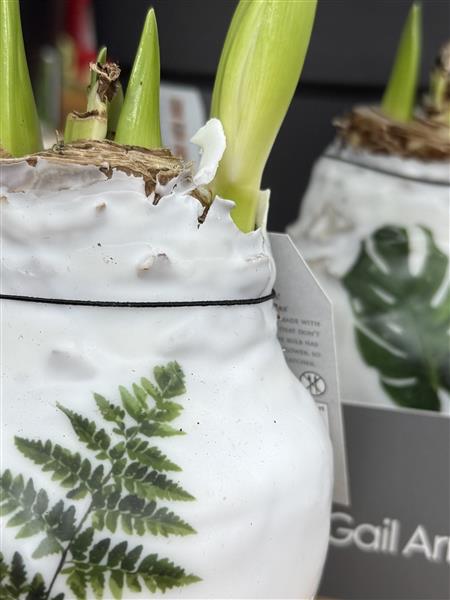 A Amaryllis Bulb in a waxed decorated outer. Presented on a glass plate and delivered in a gift box.