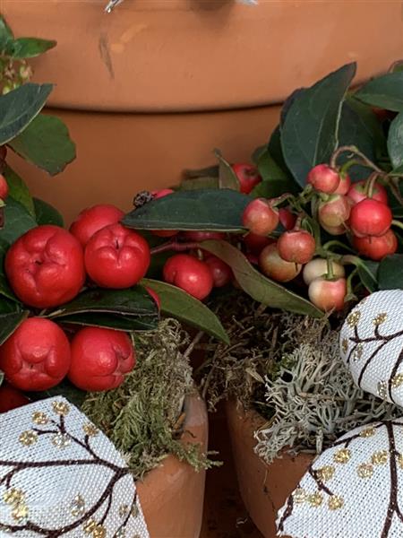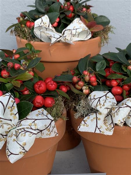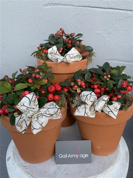 3 Natural terracotta pots filled with red Berry plants and decorated with natural ribbons. Ideal for outdoors or indoors on a tray. The pots have holes in the base for drainage for outdoor use.