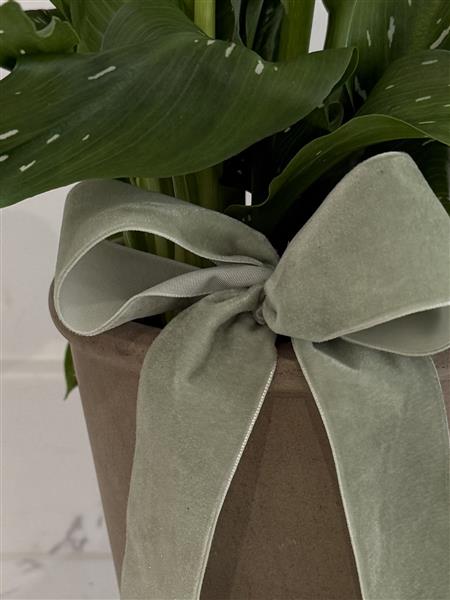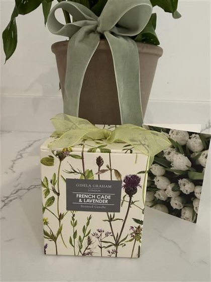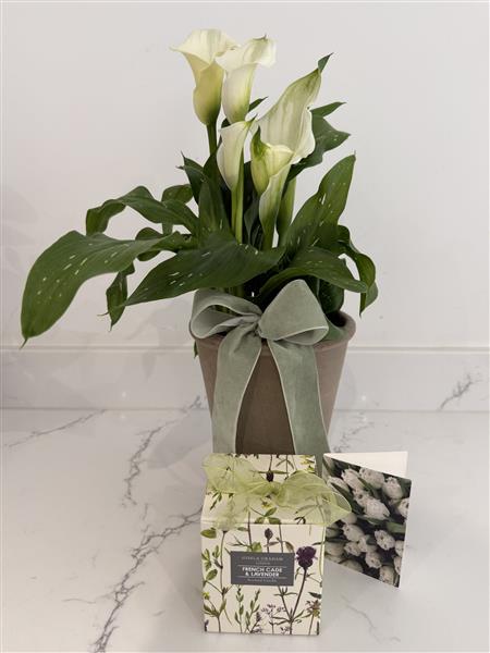 White Calla Lily plant in Clay pot with a scented candle in a painted glass jar. Gift boxed with a handwritten folded gift card.