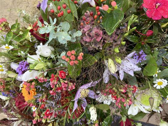A combination of loose country and wild style flowers, herbs and grasses in a mixture of colours which vary seasonally.