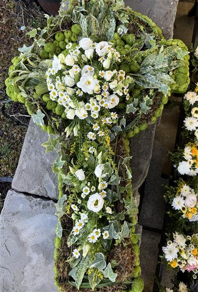 A Celtic Cross Tribute with natural flowers and foliage. Standard price is as shown in greens with white spray.