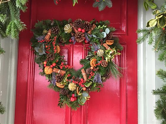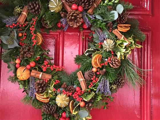 This Large Fresh Christmas Heart shaped Wreath if handmade. Fresh pine, cinnamon, fruit and cones are just a few of the decoration.