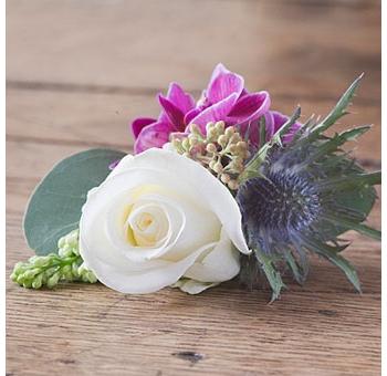 A delicate corsage incorporating a Rose with mixed seasonal touches including Eryngium.