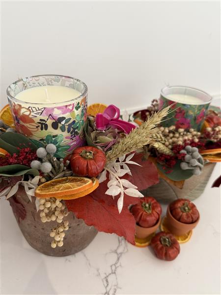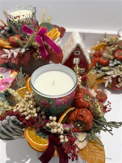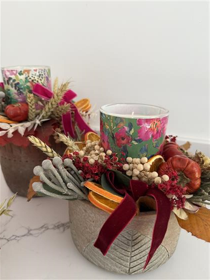 Dried flower arrangement with a beautifully scented candle in a glass that can be upcycled when the candle is spent to a small flower vase .