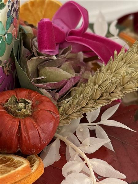 Arranged in a natural clay pot with dried oranges and pumpkins with preserved leaves and grasses.