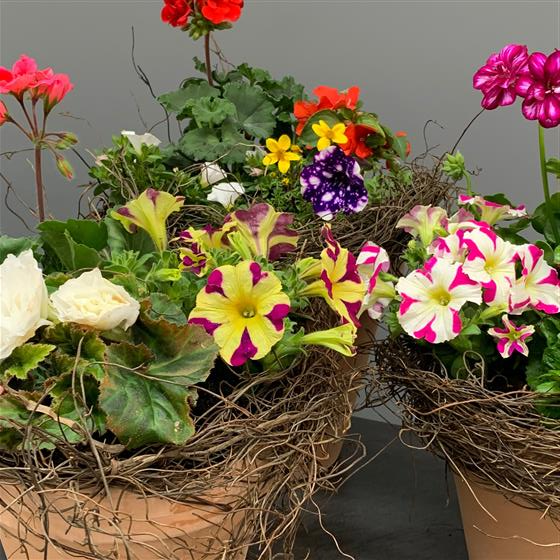 For the garden a natural terracotta pot filled with summer flowering plants. Mixed bright colours that will grow and give joy all summer.