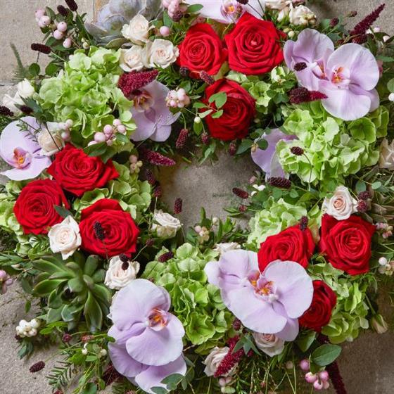A loose wreath with a natural, effortless style, enhanced by exotic orchids and striking red roses. This creates a glamorous and dramatic effect, adding a high fashion flair to the traditional wreath.