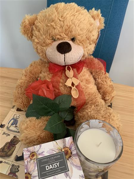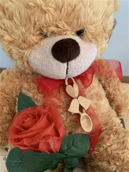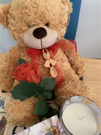 A hand carved wooden love spoon and a beautifully scented candle in a glass .