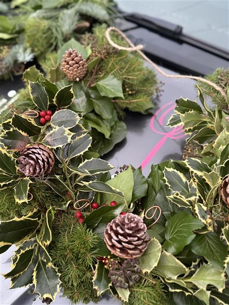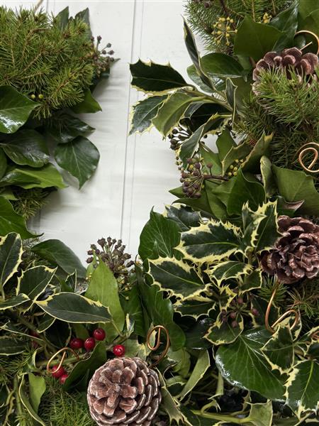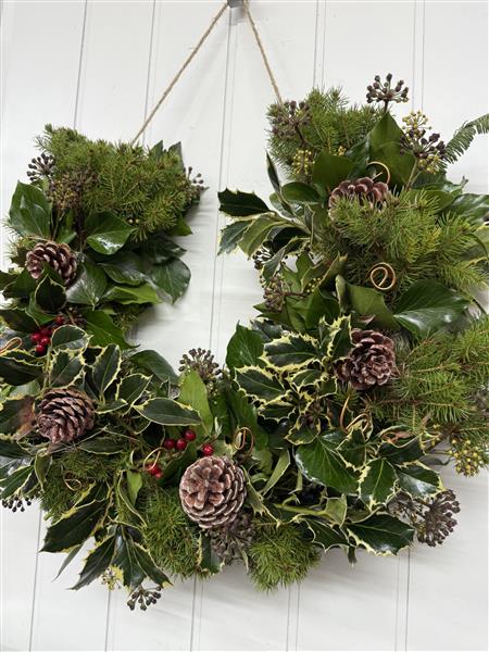 This lovely unusual door wreath is in a horseshoe shape. Fresh foliages including pine, holly, ivy and herbs and studded with natural cones.