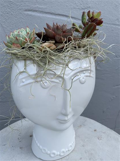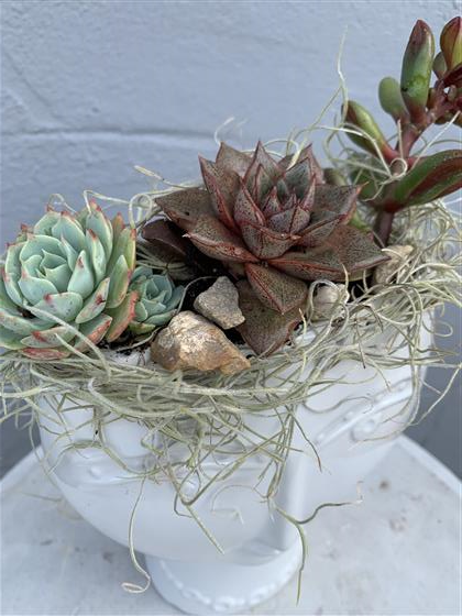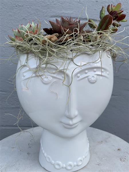 Very pretty white ceramic vase filled with easy to care for succulent plants and air plants.