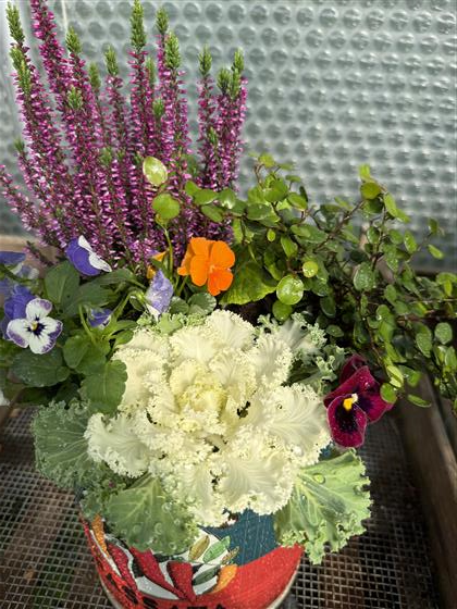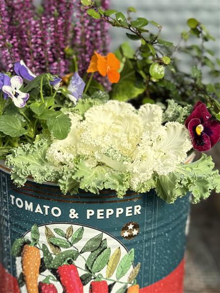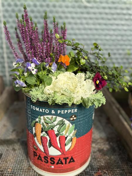 Fun Large Can with a foodie theme decoration. Filled with a seasonal selection of flowering plants. A long lasting gift that’s bright and cheerful.