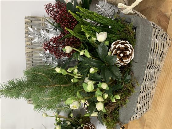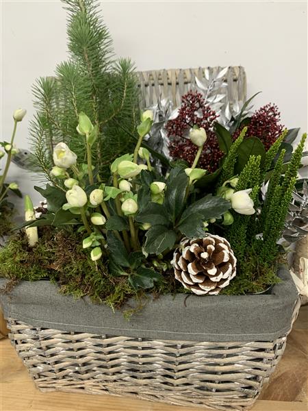Lined hamper basket filled with seasonal plants including foliage and flowering plants. A lovely gift for a plant collector.