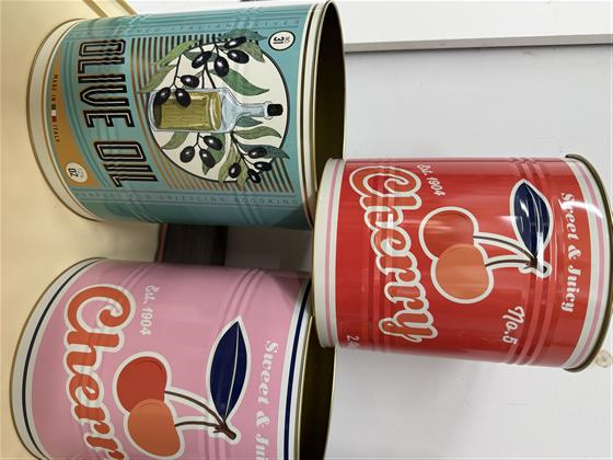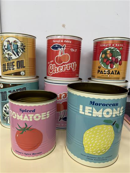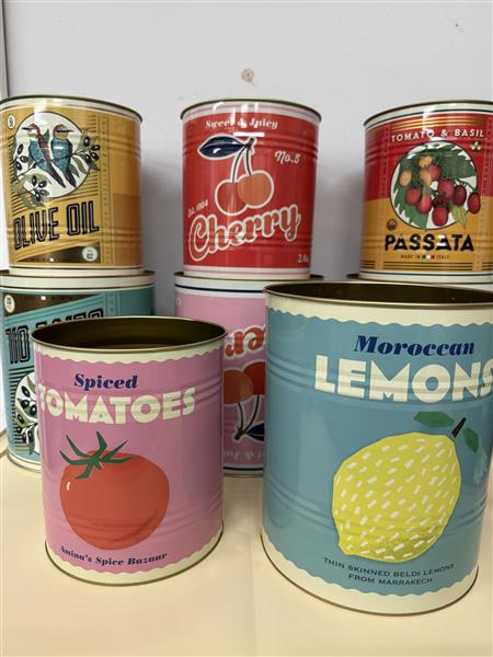 These Mediterranean style painted cans are great for plants , flower or as storage containers in the kitchen. Decorated with chilli, lemons, tomatoes, cherry and olive.