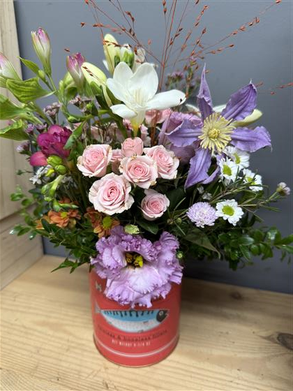 Seasonal Fresh flowers arranged in a bright can. The cans vary and we’ll pick one from our range of olive, fish, lemons or tomatoes to blend with the flowers. The can can be upcycled and will be so useful in the kitchen to hold cutlery or as a plant pot.