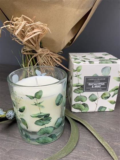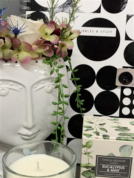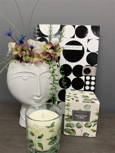 White sculptural vase filled with everlasting flowers, a beautiful scented eucalyptus and mint candle in a decorated glass and a large notebook.