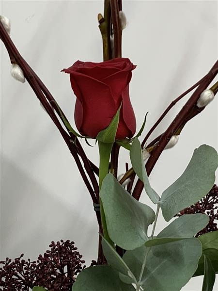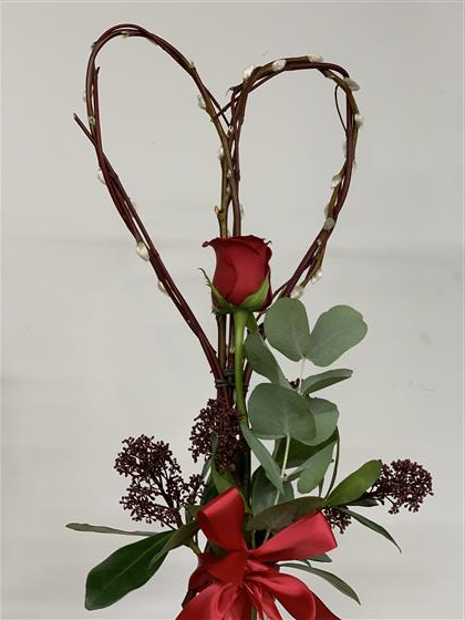 An elegant tall glass vase with a deep red rose and lush foliage. Finished with a handmade willow heart and satin bow delivered in a gift box.