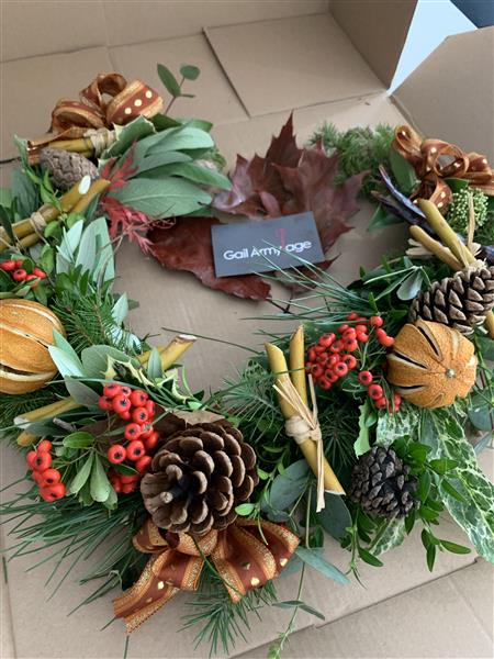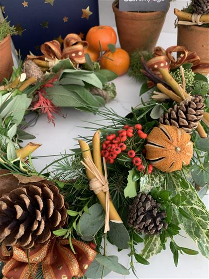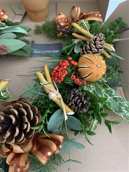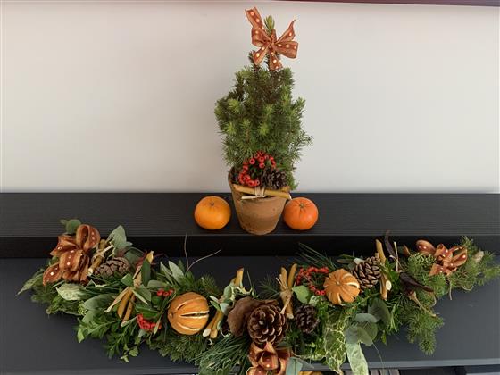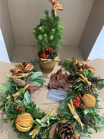 Packed with seasonal scented foliage, cones and fruits. The garland has two loops to hang it up or you could use it as a table decoration. Finished with pretty bows the standard is approximately 50cm. The deluxe box includes a mini pine tree in a terracotta pot with cone and bow decoration.