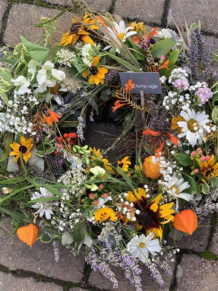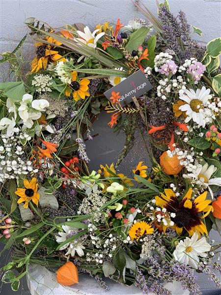 A totally natural wreath, no foam, handmade with natural branches and seasonal flowers and herbs.