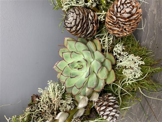Added mini cones, pussy willow and a sedum plant finish off the design.