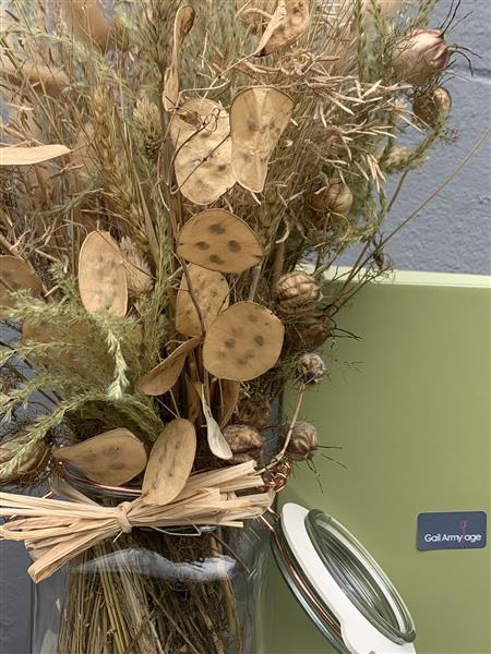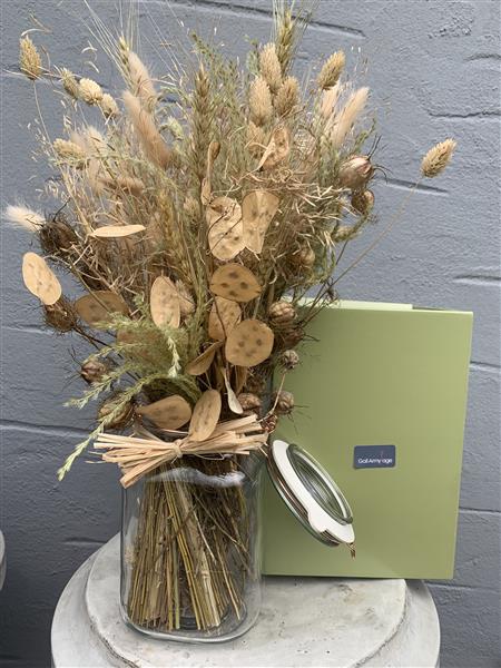 From our Pickle Jar Range these Natural Dried Flowers are arranged in one of our glass pickle jars.