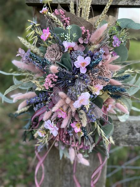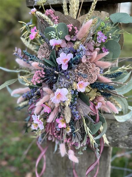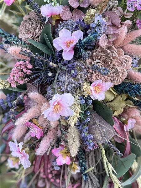 A pretty swag of dried and natural looking artificial flowers . Grasses, lavender, magnolia leaves and flowers make up this hanger. Can also be used as a table centre.