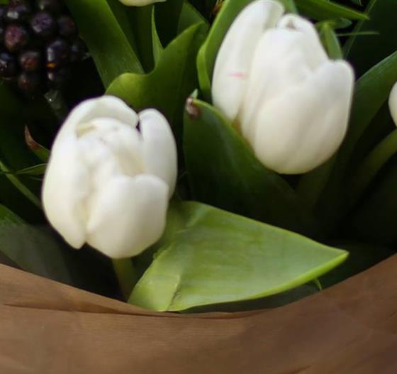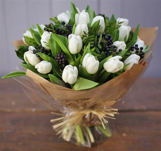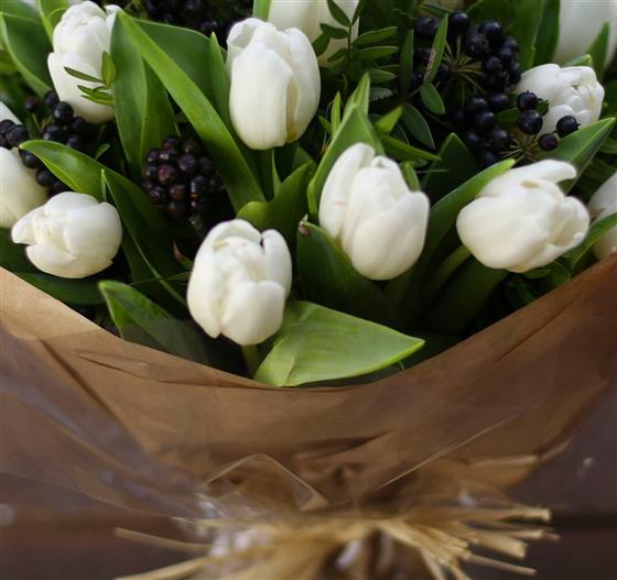 A chunky hand tied posy of white tulips and seasonal foliage. Simple and stylish.