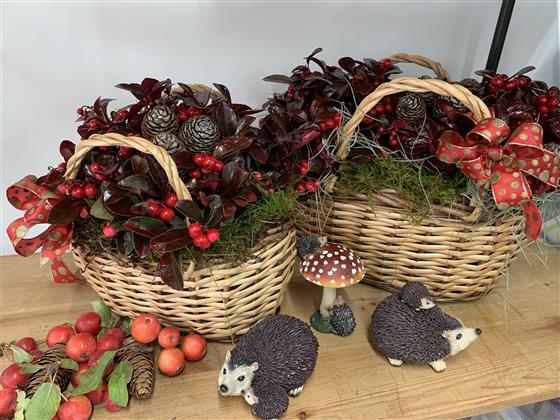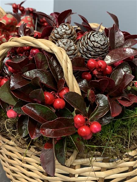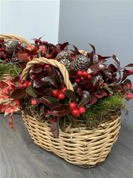 Glossy red berry planted shopping basket with added mini cones and luxury bow.