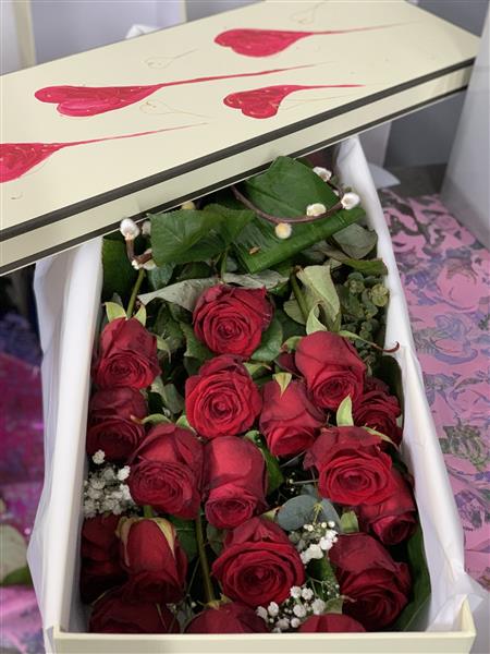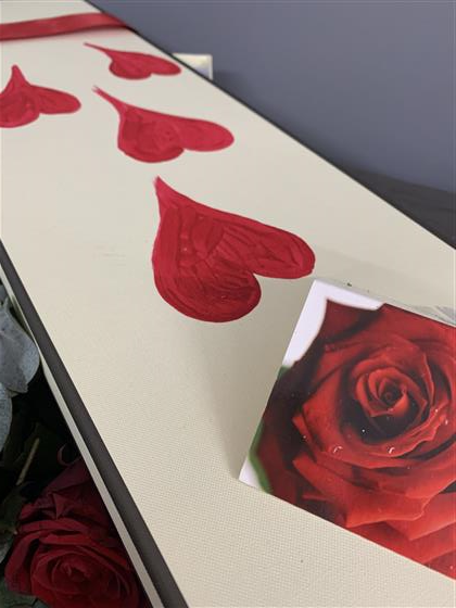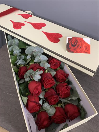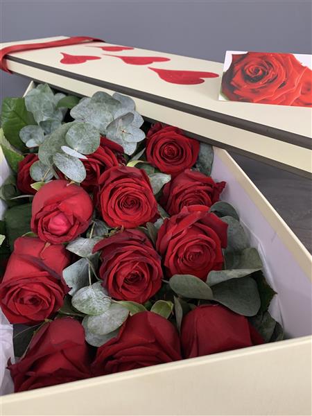A dozen large headed red roses and scented eucalyptus presented in a beautiful quality cream box that has a hand painted lid.