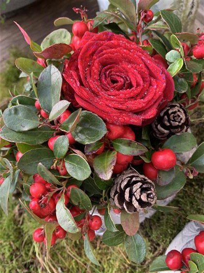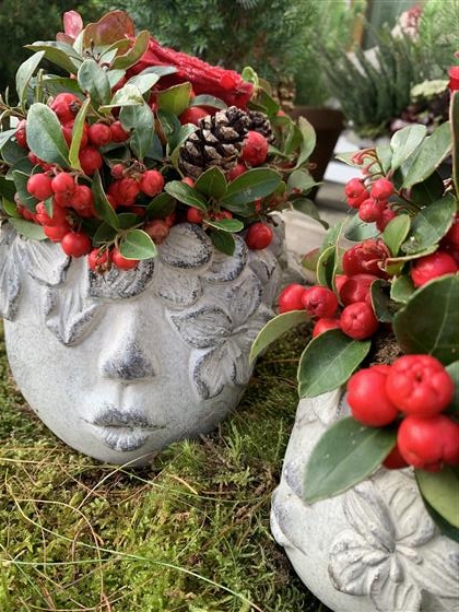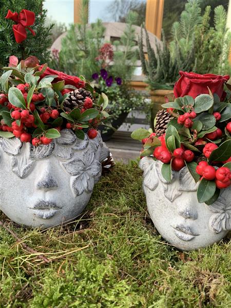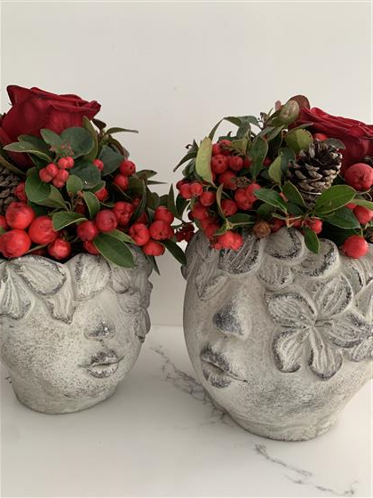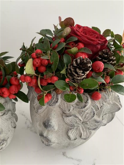 Gorgeous stone head planter filled with berry plant and finished with a deep red rose cut bloom.