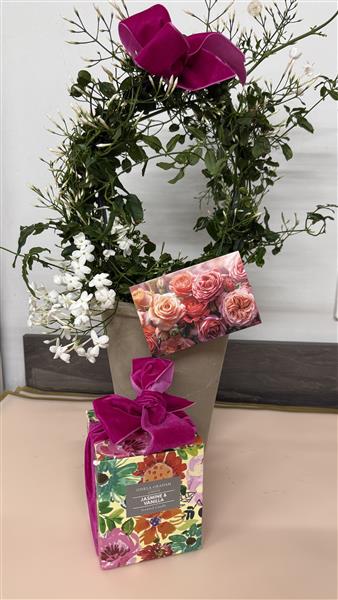 Beautifully scented Jasmine plant in a clay pot with velvet bow and a sweetly scented candle in a painted glass. Gift boxed with a handwritten folded gift card.