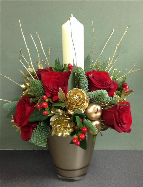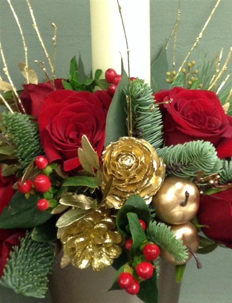A single candle arrangement. Created using blue spruce, rich red roses, hypericum berries with golden cones and artificial apples.