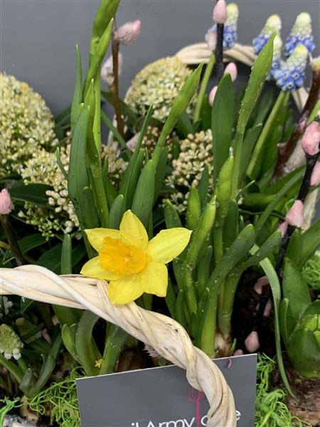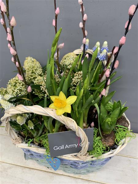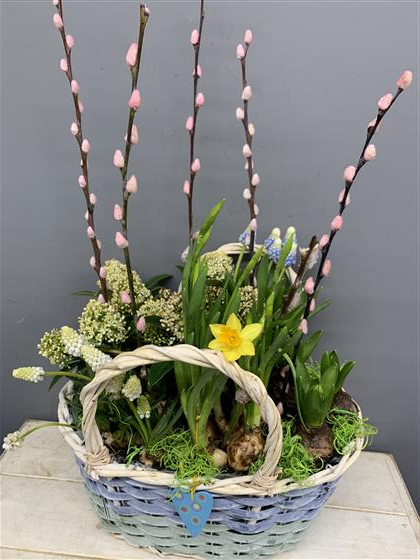 A pretty shopper style basket filled with spring bulbs and seasonal plants, finished with pussy willow stems and a complementary wooden heart.
