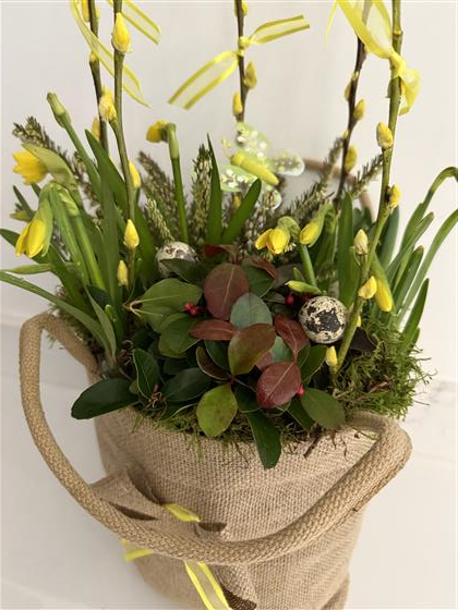 Naturally planted tote bag with spring plants including bulbs and finished with mosses and pussy willow.