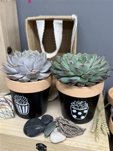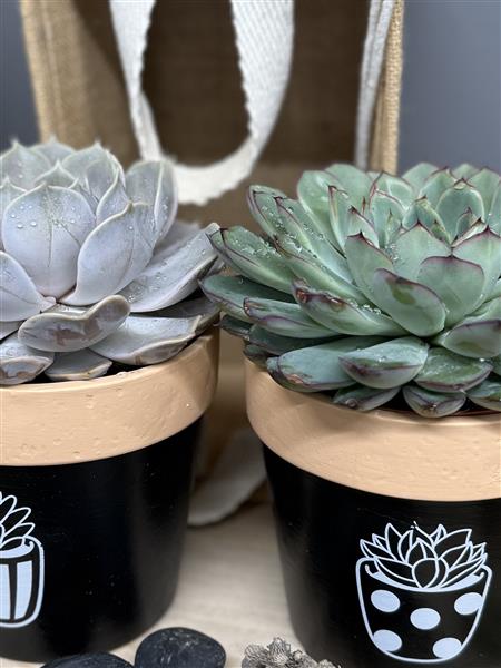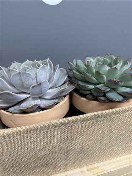 2 large succulent plants in decorative pots presented in a natural hamper. Easy to look after plants with very little watering required.