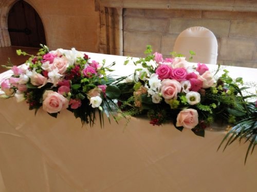 This long and low-style arrangement is a popular choice for the wedding top table or registrar's table. This fresh flower design features flowers in shades of pink and white, but can be made in a range of colour schemes. You can choose one of these designs, or multiple to be positioned along a large table.