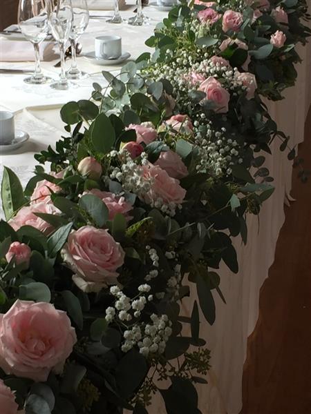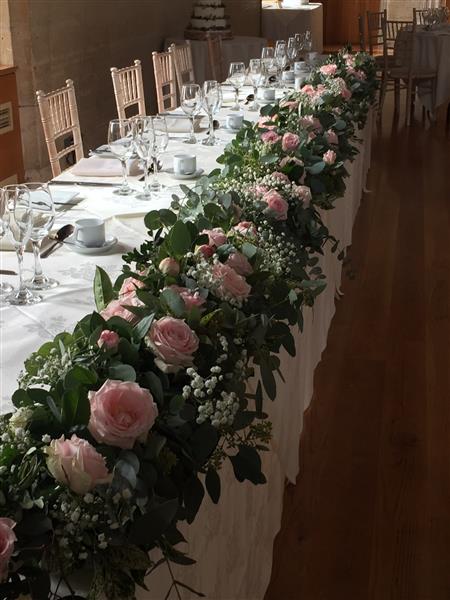 We decorate the whole top table with flowers and foliage. We quote on this depending on the length of table and the fauna used. These photos are for reference only as everyone has a different set up. Contact us to discuss.