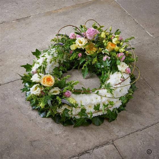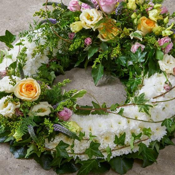 Tendrils of ivy waft over a traditional chrysanthemum base, giving this large, impressive wreath a modern finish. The pretty pastel-coloured flowers set against lush foliage accentuate the wreath's romantic age-old style and convey a tender goodbye.
