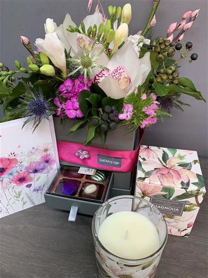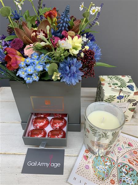 This gorgeous Treasure box is filled with seasonal flowers, The secret drawer contains delicious truffle chocolates. Relax with a scented candle and give us a message to add to the large pretty gift card.