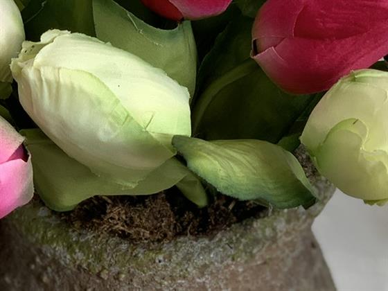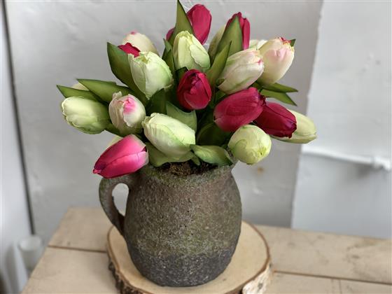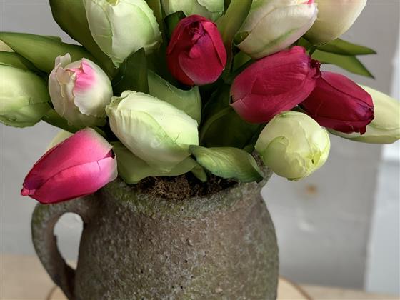 A stone natural look jug filled with silk tulip flowers and foliage. An everlasting gift made with artificial tulips of the highest quality that look so realistic. For delivery locally , cannot be sent in post. Please note these are artificial flowers not fresh.