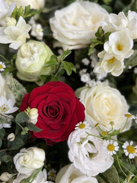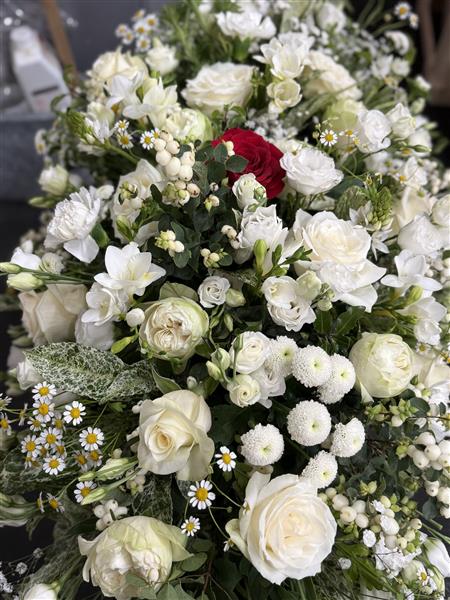 A Casket spray of all white flowers , including roses, freesia and soft complimentary white blooms. Although this spray is all of white flowers you can have A single red rose nestled in the centre for a symbol of eternal love. Just let us know and we will add this touch for you.