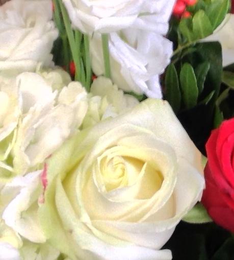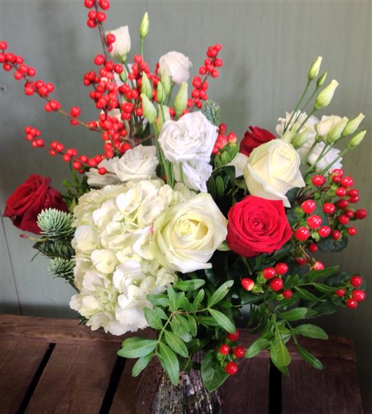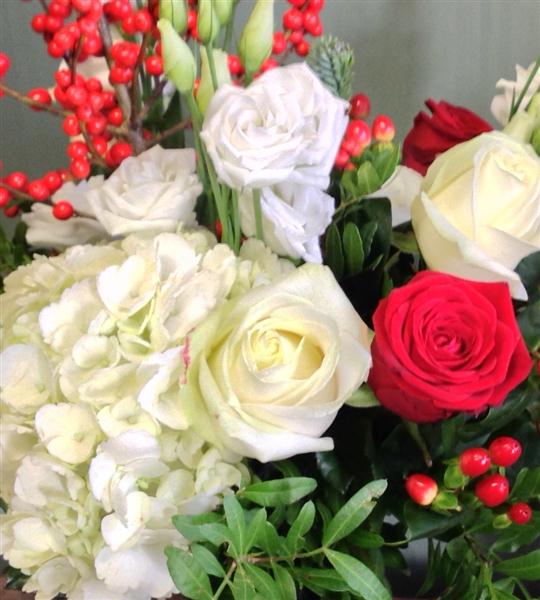 Ilex and hypericum berries, white and red seasonal flowers and winter foliage - a beautiful festive display. Flowers mix varies.